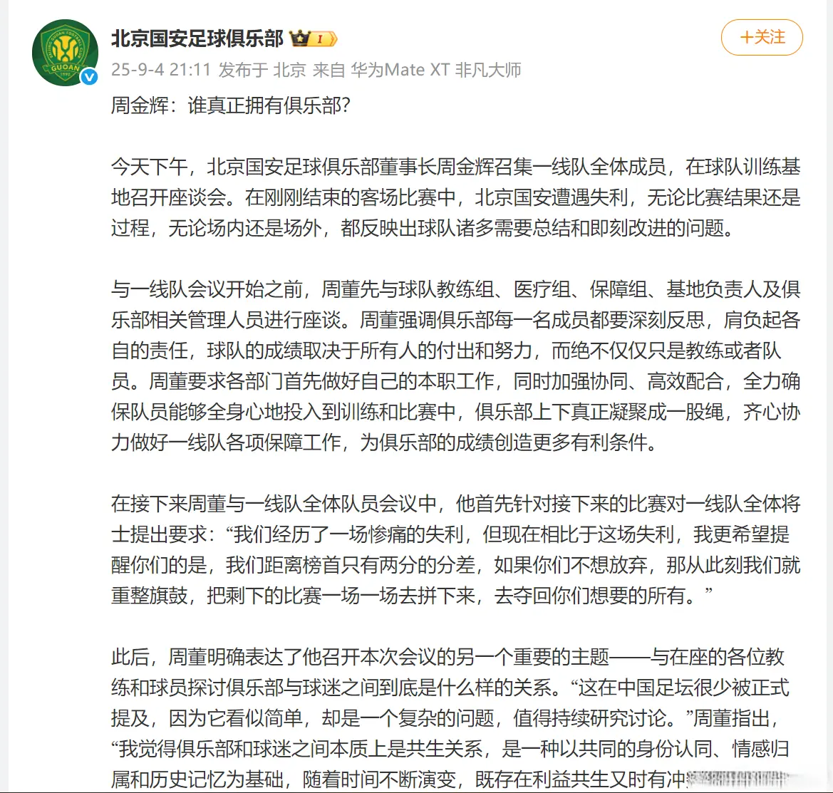 从31日晚上比赛到4日,4天过去了,北京国安终于再次发声。4日晚上21点11分,北京国安发布了《谁真正拥有俱乐部?》的主题文章。俱乐部发文表示董事长周金辉召集一线队全体成员召开座谈会。