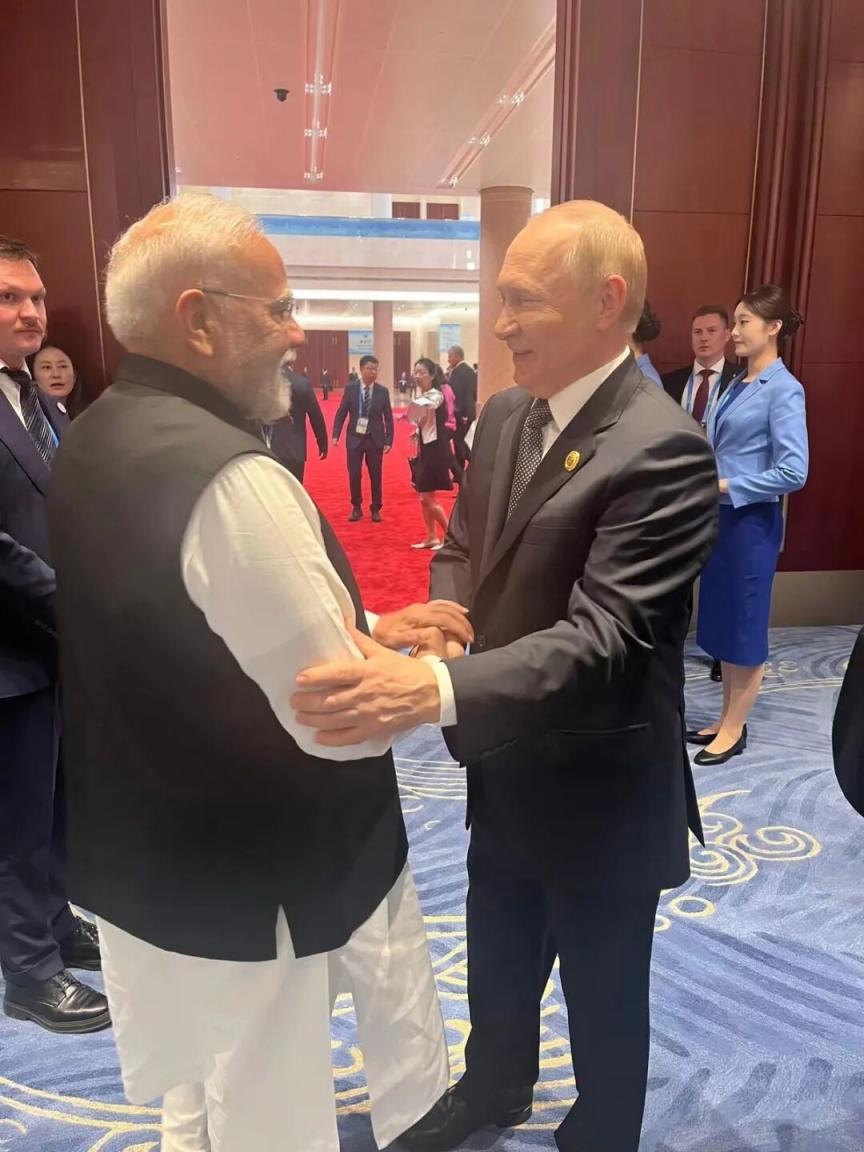 莫迪和普京热烈拥抱,然后手拉着手,进了会场;中俄印三国领导人站在一起,微笑畅谈了很长时间。全世界都看到了这一幕。