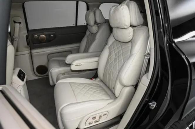 中排的两个独立座椅同样出色,不仅支持前后移动和靠背角度调节,还有腰部支撑和腿托调节功能,加热和按摩功能也没有缺席。中排的空间比前排还要宽敞,我坐在中排,腿部距离前排座椅还有两拳多的空间,就算把腿伸直也完全没问题,头部空间也有一拳多。中排座椅之间的通道很宽,就算穿着厚重的羽绒服,也能轻松从中间走到后排。而且中排还配备了可调节的扶手,扶手上面有控制座椅功能和空调的按键,操作起来很方便。