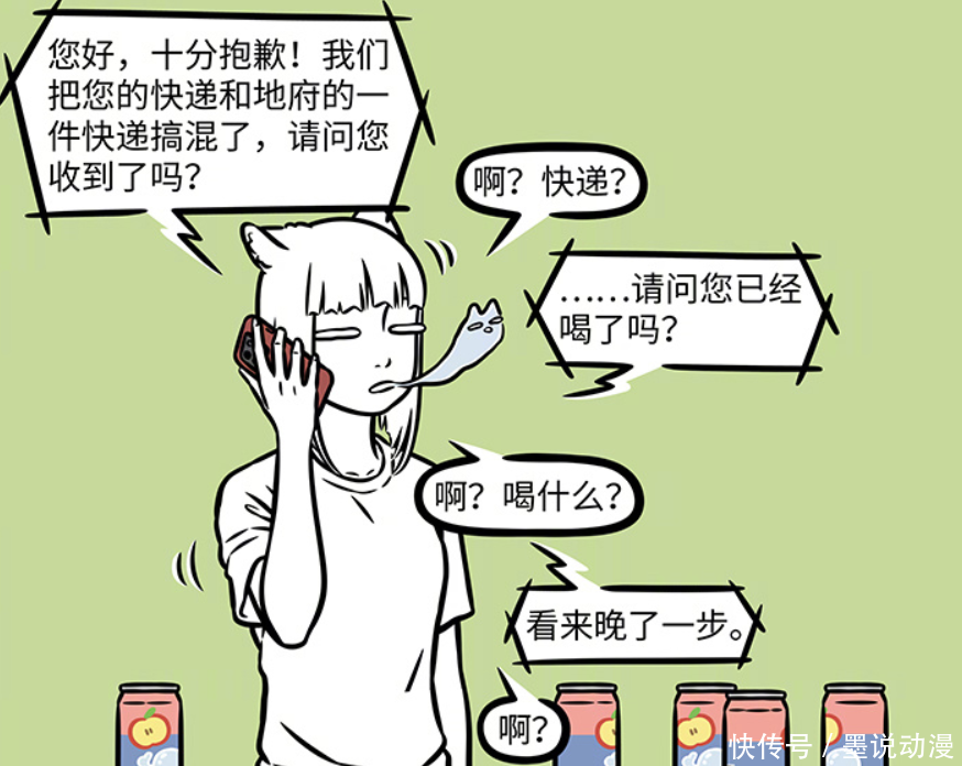 《非人哉》漫画第1153话更新,孟婆虽然没跟月老合作,但以孟婆汤作为原料,衍生出多款地府专用饮料。其中包括牛奶、黄泉水和汽水。九月原本是买了正常饮料,可是没想到快递公司弄错,九月喝的这种饮料,带有忘忧效果,所以导致失忆。