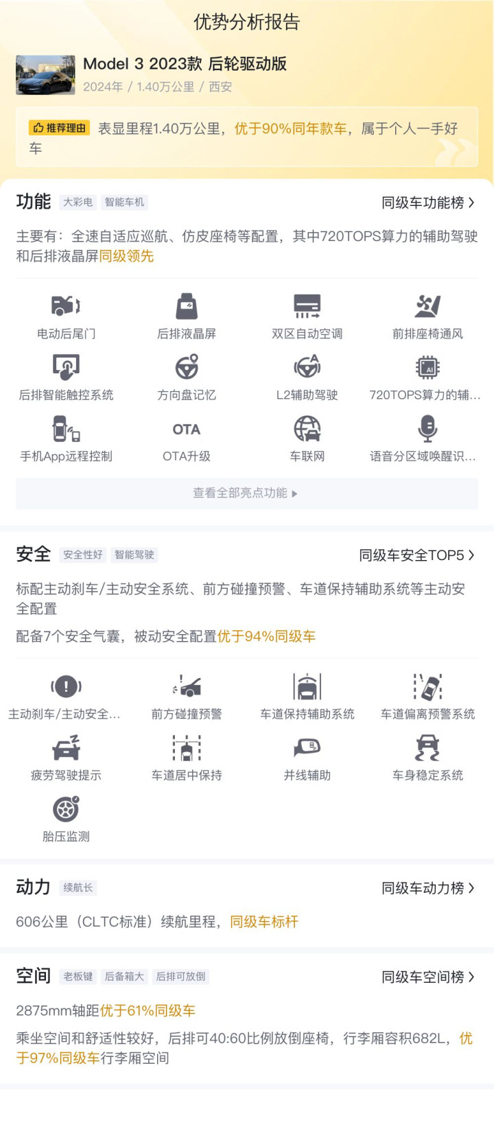 这辆二手Model 3 2023款 后轮驱动版,上牌地车源地均为西安,上牌日期2024年12月,表显里程1.4万公里,车身颜色为深灰色,未过户。新车指导价23.19万,现卖家报价18.58万。