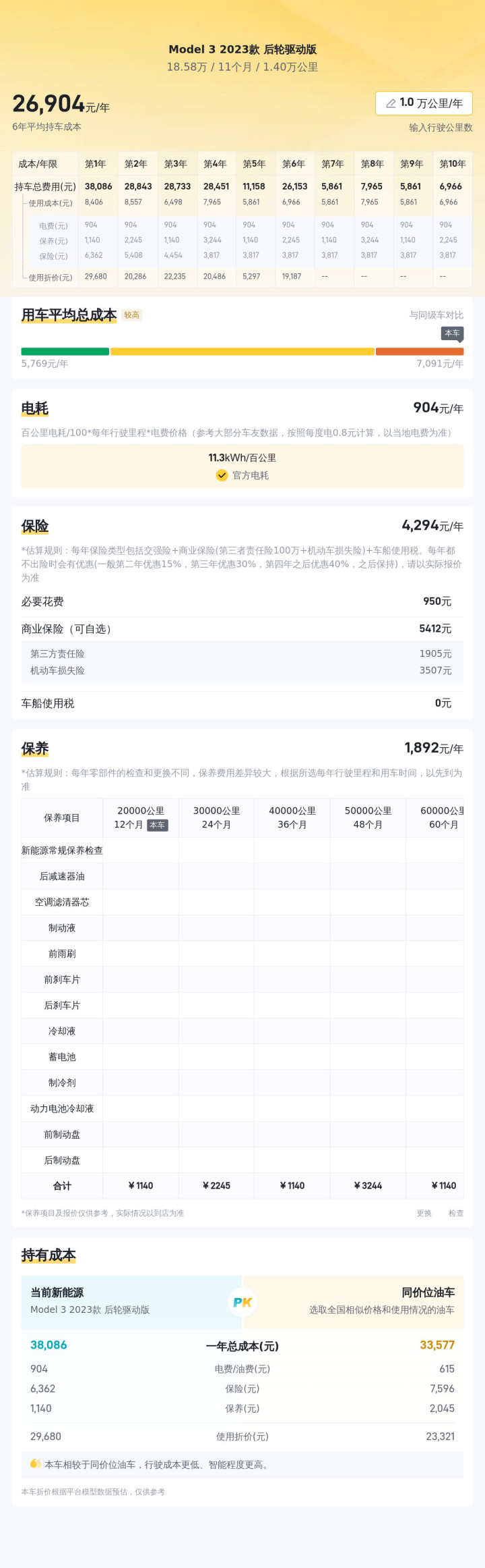 根据懂车帝的数据,这辆二手Model 3 2023款 后轮驱动版的市场行情价为16.77-19.72万,它的报价18.58万位于中间值,在市场中价格较便宜。在用车成本方面,这辆车年均综合用车成本大概在每年7千元左右。具体费用可能包括车险、保养、电费、停车费等。这些成本因个人使用习惯和地区差异等因素而有所不同。根据懂车帝的大数据计算估测,该车再行驶2年后,仍可卖15.55万,可见其保值率较高。